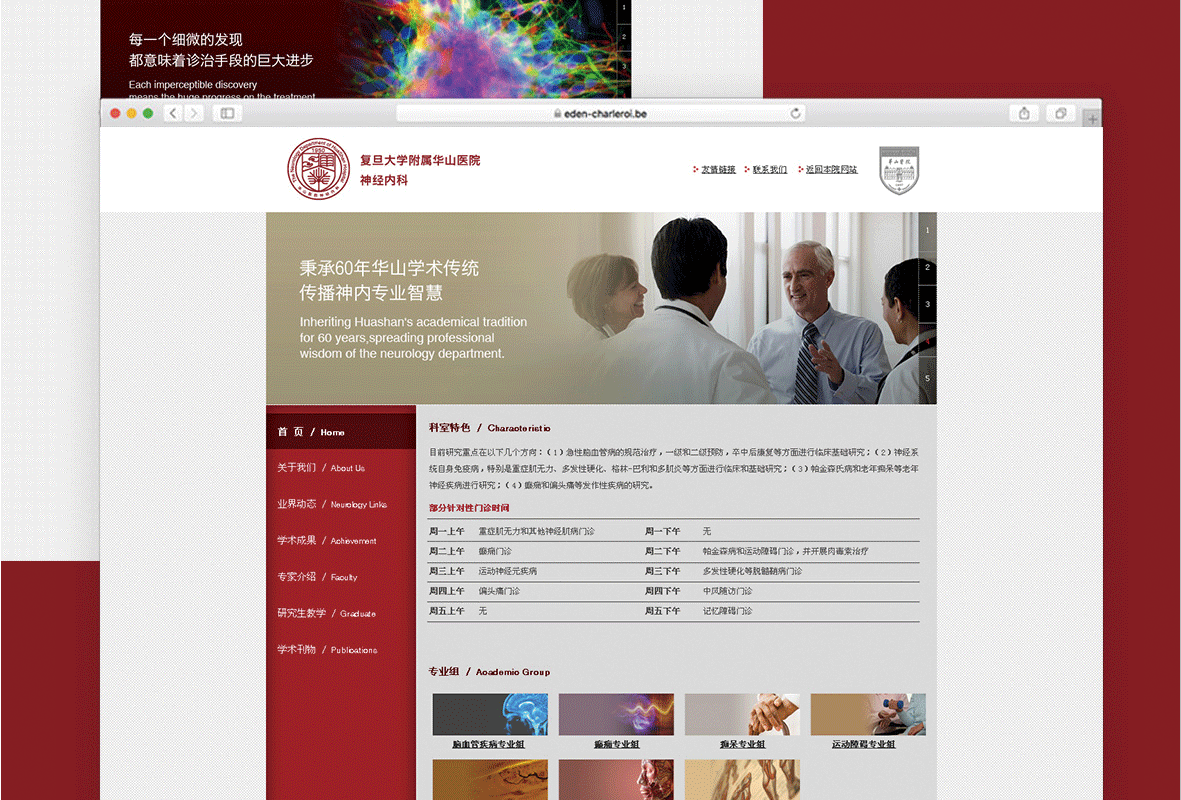 华山医院神经内科是国内神内领域最著名的教学科研治疗机构,新的科室形象准确传达了科室权威、国际以及学术、科研、学术相结合的科室形象,同时也保持了和医院整体形象的一致性,新的科室形象受到了用户极高的认同。